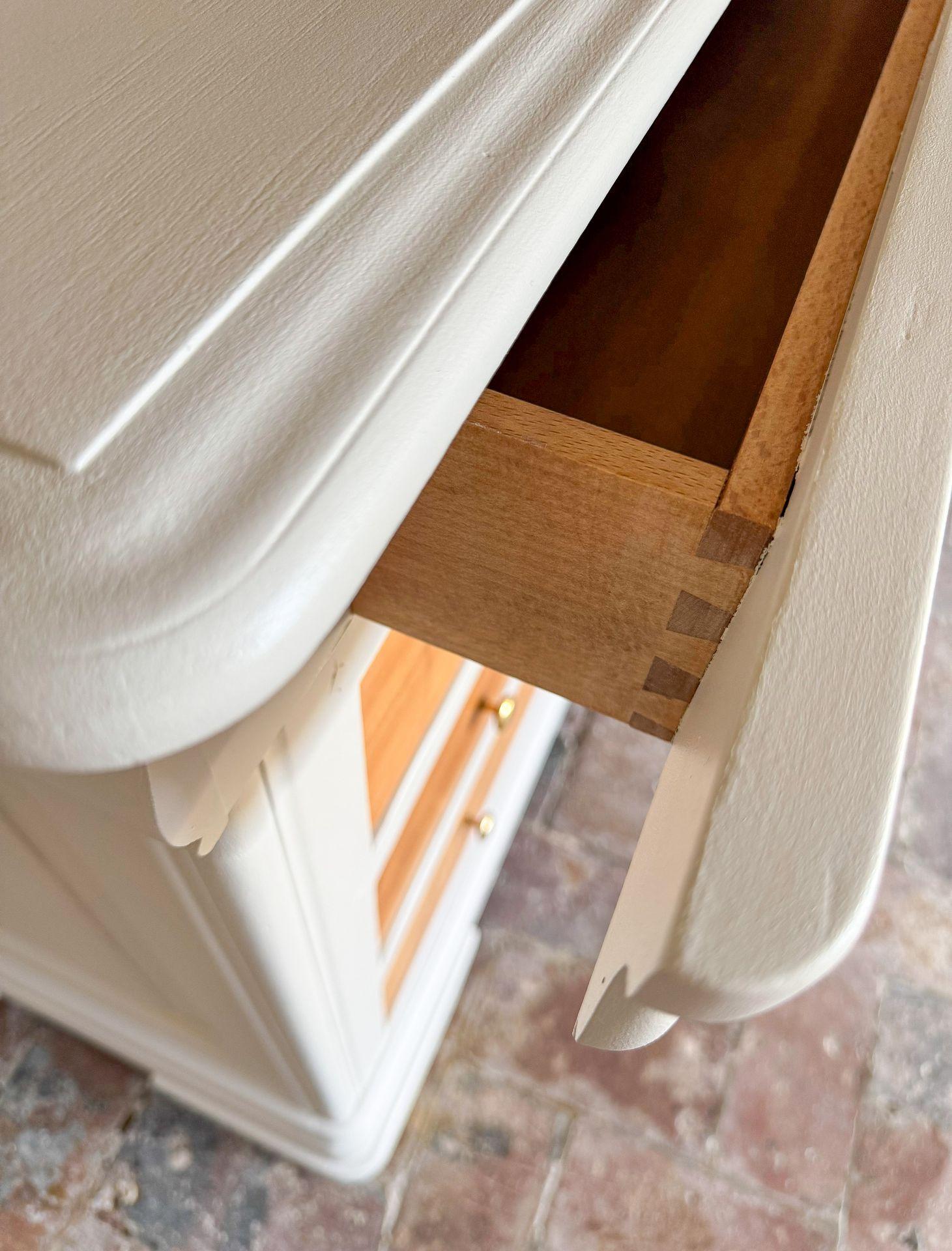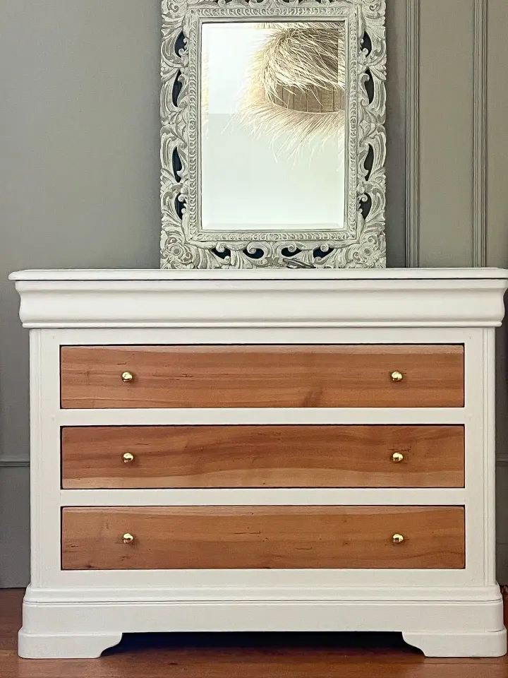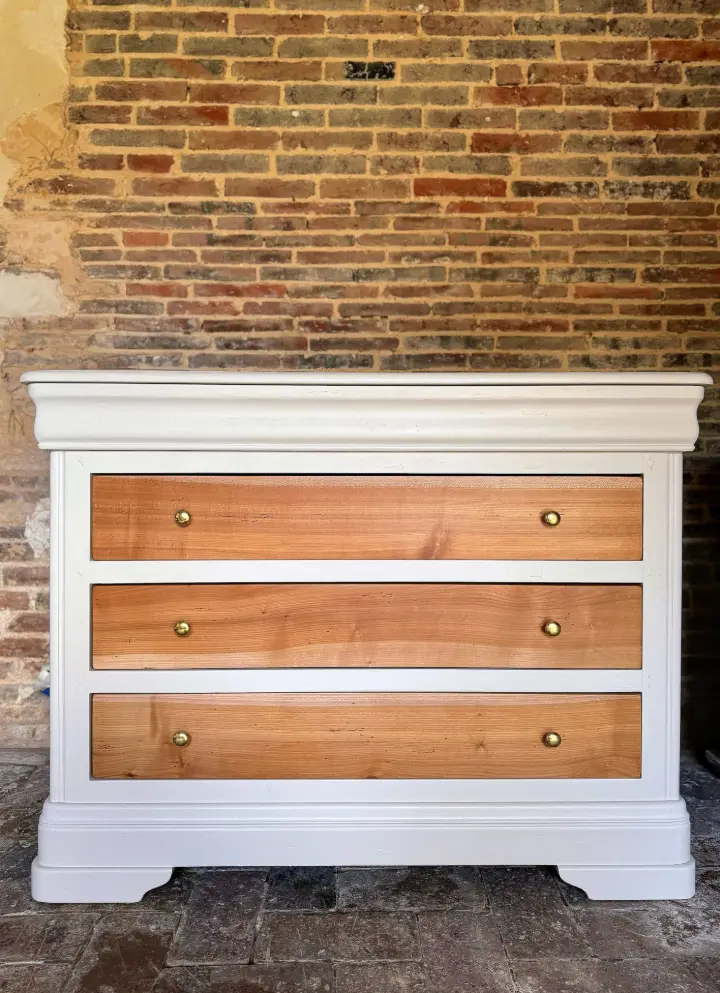 La proposition retenue fût donc la suivante : repeindre l'ensemble de la commode en un joli blanc grisé mat au rendu poudré et conserver les tiroirs naturels.