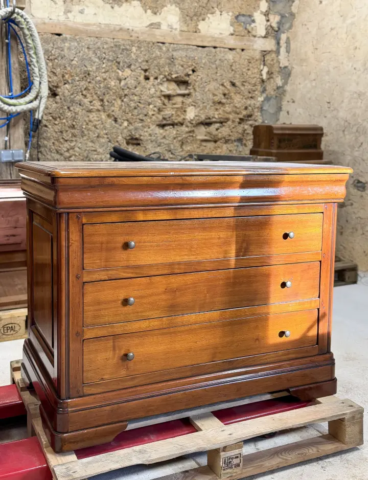 Un vernis mat incolore a bien évidemment été appliqué pour protéger la peinture des aléas du quotidien et pour simplifier l'entretien de cette jolie commode.