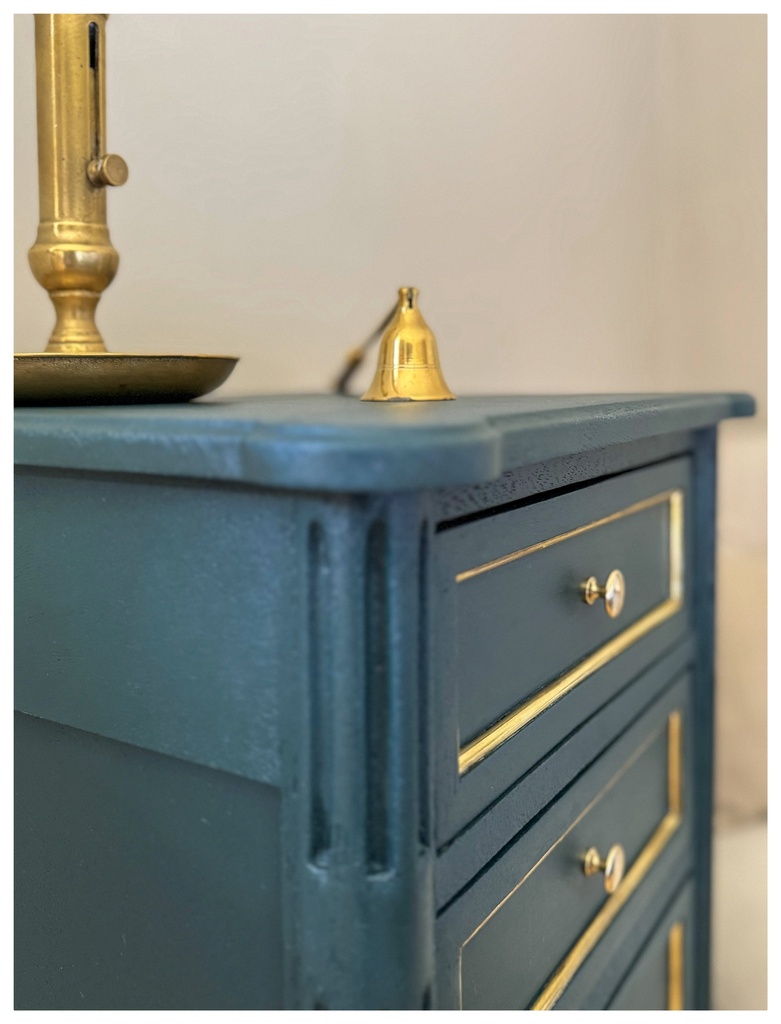 Ce petit meuble d'appoint est tout en élégance grâce au magnifique Vert Cyprès qui se marie à merveille avec ses jolis détails en laiton.